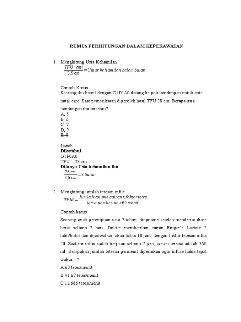 83% (6) 83% menganggap dokumen ini bermanfaat (6 suara) 19k tayangan 4 halaman. Berapakah jumlah tetesan per menit jika seseorang membutuhkan 3 plabot nacl 0,9% dalam 1 hari? Sebelum anda menghitung tetesan infus terlebih dahulu anda harus tahu cara mengatur jumlah tetesan infus/detiknya. Cara menghitung pemberian cairan infus 1. Contoh soal ukom keperawatan beserta jawabannya contoh soal ukom keperawatan.